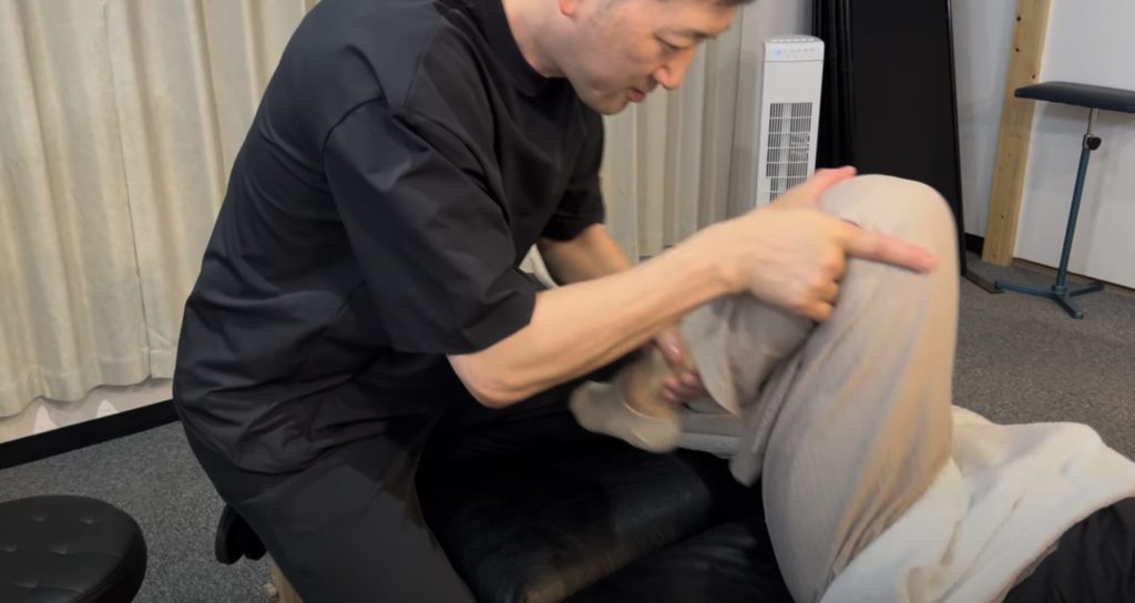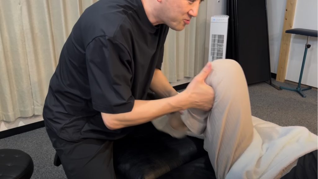 大腿部の外側にある腸脛靭帯の癒着があり、さらにももの前側の大腿四頭筋という筋肉の中でも大腿直筋という筋肉が癒着して動きが悪くなり正座ができない原因となっていました。