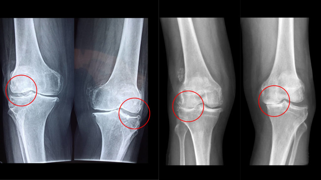 上記のレントゲン写真は変形性膝関節症の症状です。皆タイプが異なっています。