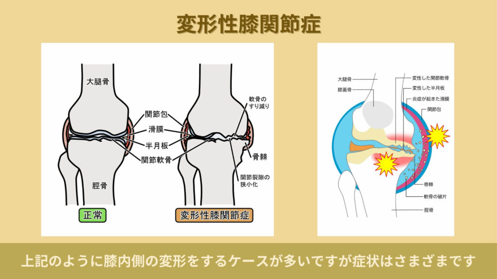 このようなことで膝に炎症が起こり、膝の関節面の損傷が進んで変形してしまうものです。