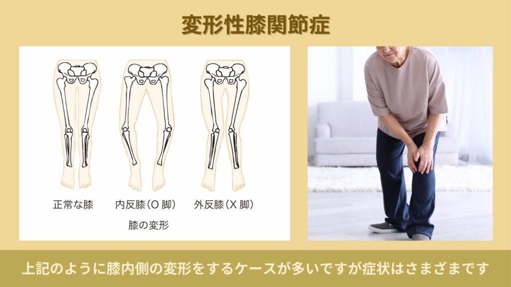 さらにかばっていたり偏った使い方によって足が変形するとO脚のように膝が外に出てしまうシーンをよく目にするのも変形性膝関節症です。