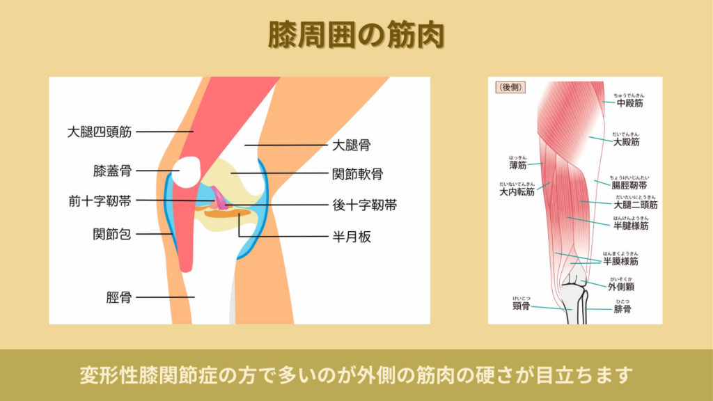 右膝に関しては半月板損傷と変形性膝関節症による痛みでやはり筋肉の硬さと膝の捻れによって痛みがあった為それに対するアプローチをしました。