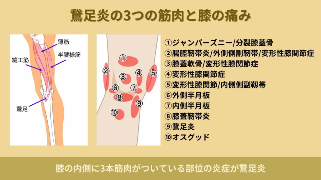 縫工筋(ほうこうきん)、薄筋(はっきん)、半腱様筋(はんけんようきん)という3本の筋肉が膝下の内側に付着していて、その筋肉が炎症を起こすと膝の内側に痛みが発生します。